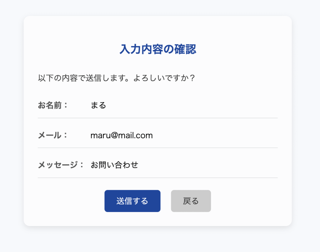 確認画面では、ユーザーが入力した内容を表示して「送信」または「戻る」を選べるようにします。