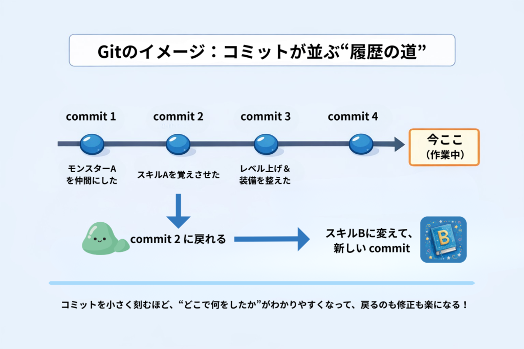 Gitとは、作業の区切りごとに「セーブ(コミット)」を作っておいて、あとから好きな地点に戻れる仕組みです。
